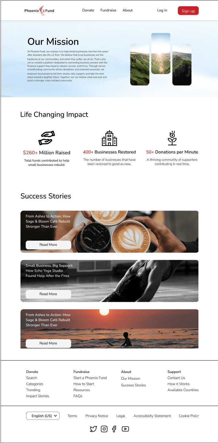 At its core, Phoenix Fund aims to bridge the gap between small businesses in crisis and the communities that want to support them. The platform is designed to not only provide immediate financial relief but also foster long-term recovery by ensuring a seamless, trustworthy, and impactful donation process. Now that we have completed our initial user research, I determined 3 goals for the project that meet both user and product needs.