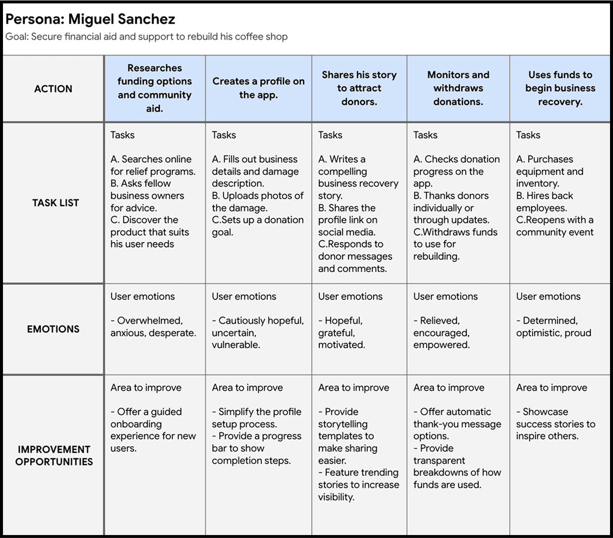 To better understand how small business owners and donors interact with crowdfunding platforms in times of crisis, I conducted user research focusing on their needs, motivations, and pain points. My process involves 4 key steps: brainstorming Empathy Maps, creating Personas, writing User Stories, and drawing User Journey Maps. Each step provides a unique insight to the user’s experience and allows us to empathize. By following this structured approach, I ensure that Phoenix Fund is designed with a deep understanding of its users, making it more intuitive, effective, and impactful for businesses in crisis.